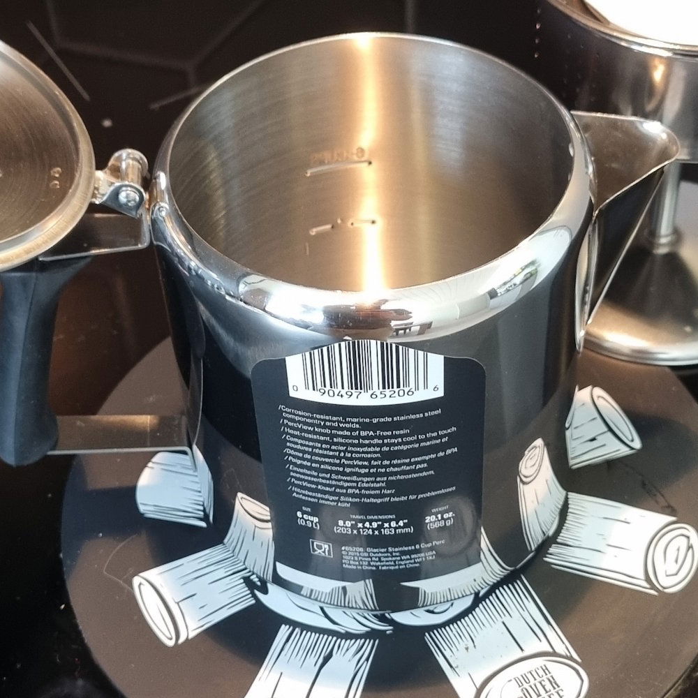 Dankzij het hittebestendige siliconen handvat. Kan je de percolator zonder handschoen bedienen. De vaste deksel met kunststof dop zorgt ervoor dat je kan zien hoe ver je koffie is. De percolator is met 500 gram erg licht, waardoor je hem makkelijk meeneemt. Boven op het filter zitten gaatjes aan de zijkant, wat ervoor zorgt dat de percolator niet kan overstromen als het filter niet meer doorloopt. In de deksel zit een stoomgaatje, waardoor de deksel niet zal klapperen. Door middel van de randjes in de percolator kun je aflezen hoeveel koffie er in de percolator zit als een soort maatbeker. De dop bovenop de percolator (waar je de koffie door ziet stromen) is van kunststof. De doppen hebben wij ook los in ons assortiment.Â