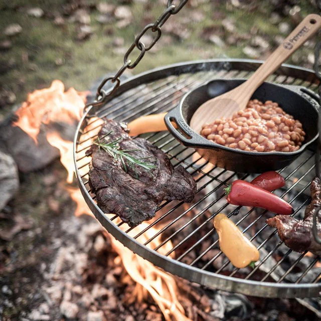 Steaks, filets en zelfs groenten krijgen de intense aroma’s van het houtvuur en door de structuur van het rooster ontstaat het typische grillpatroon, terwijl het eten bijzonder sappig blijft. De verhoogde rand rondom het rooster voorkomt tegelijkertijd dat het eten van het rooster afvalt. Zo kun je je grilloppervlak een extra draai geven en genieten van het slingereffect van de grill. Met een oppervlakte van 50 cm in diameter heb je bovendien voldoende ruimte voor de meest vurige vleesgerechten en vul je meerdere hongerige magen.