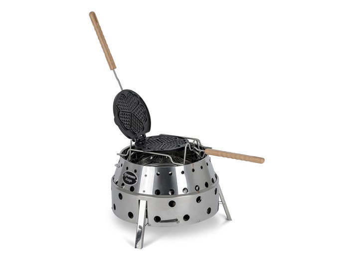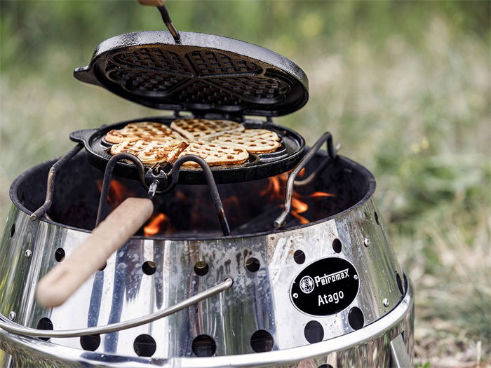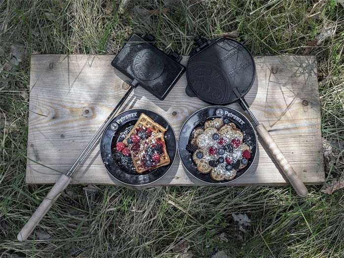 Met de Petromax Wafelijzer met draaiframe maak je buiten de lekkerste, knapperige wafels boven een kampvuur of barbecue. Het gietijzeren frame houdt warmte perfect vast en zorgt voor een gelijkmatige garing. Dankzij het draaiframe kun je het ijzer 180° draaien, zodat beide kanten mooi bruin worden zonder aanbakken. De Petromax Wafelijzer met draaiframe is stevig, eenvoudig in gebruik en ideaal om te combineren met een Petromax driepoot of vuurschaal.