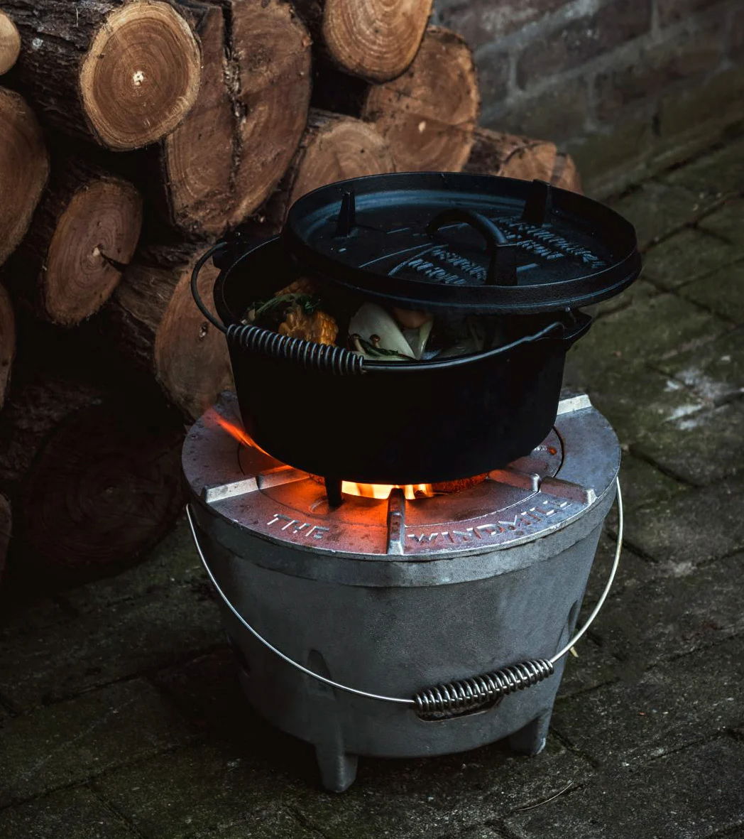 De Windmill Dutch Oven 4,5 Qt Pre-Seasoned is een veelzijdige, gietijzeren pan, ideaal voor buiten koken op open vuur. Met een inhoud van 3,8 liter (4,5 QT) is deze pan geschikt voor 2-5 personen. Het gietijzer zorgt voor uitstekende warmtegeleiding en houdt de hitte langdurig vast, wat zorgt voor gelijkmatige bereiding van stoofschotels, ovenschotels, en zelfs taarten!Deze pre-seasoned Dutch Oven is direct klaar voor gebruik en beschermd tegen roest. Een uniek kenmerk is de deksel met pootjes, die omgekeerd kan dienen als bakplaat op briketten of houtskool, perfect voor het bakken van vlees, vis of groenten op open vuur. Dankzij de pootjes onder de Windmill Dutch Oven kun je meerdere Dutch Ovens stapelen en briketten of kolen eronder plaatsen voor optimale warmteverspreiding.